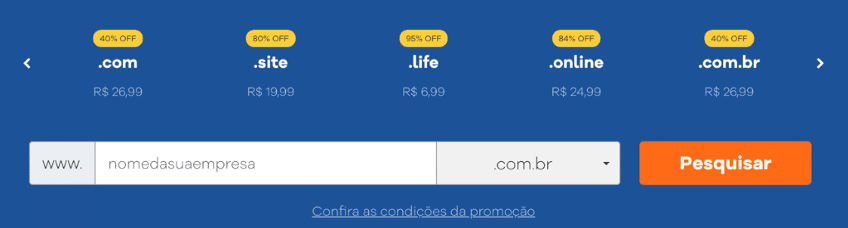 Digite o nome da sua empresa ou a forma que gostaria de ser encontrado na internet, selecione .com.br e clique em pesquisar.