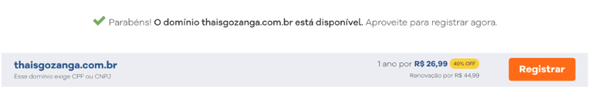 Posteriormente, a pesquisa irá aparecer se o domínio está disponível. Se positivo a imagem abaixo irá aparecer e você pode registrar (se for adquirir uma hospedagem o domínio pode sair de graça pela Hostgator).