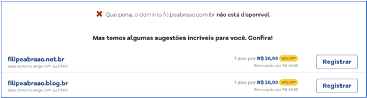 Entretanto, se o seu domínio não estiver disponível, algumas sugestões irão aparecer, e então poderá avaliar as alternativas ou encontrar outro nome que atenda ao seu negócio.